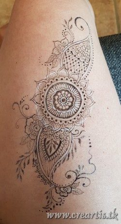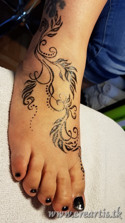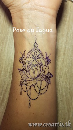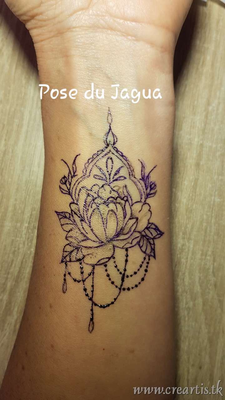 C'est la téchnique qui se raproche le plus d'un vrai tatouage car sa couleur va apparaître noir bleuté selon la peau de chacun. En effet, le jagua ne marque pas pareil d'une personne à l'autre, il peut marquer presque noir chez certaines personnes et bleu léger chez d'autres.